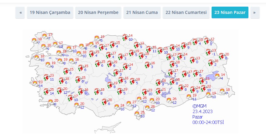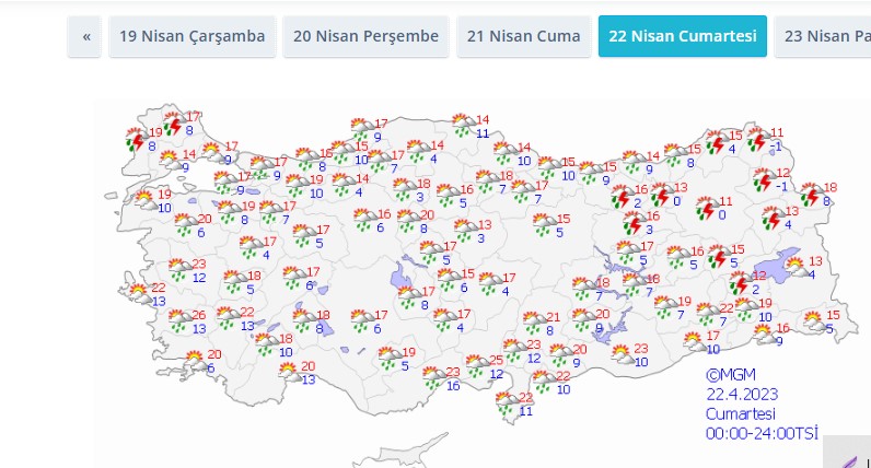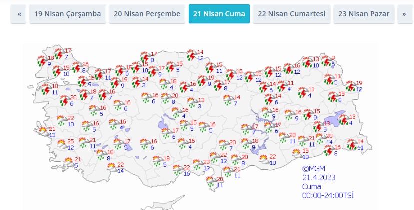 Ülkemiz genelinin parçalı ve çok bulutlu, Konya, Aksaray ve Karaman dışında bütün bölgelerin yerel olmak üzere aralıklı sağanak ve yer yer gök gürültülü sağanak yağışlı geçeceği tahmin ediliyor. Doğu Karadeniz’in iç kesimleri ile Doğu Anadolu’nun yüksek kar örtüsüne sahip eğimli yamaçlarında çığ tehlikesi bulunmaktadır.