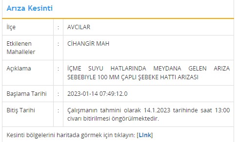 Avcılar’ın Cihangir Mahallesi’nde arıza sebebiyle bugün saat 07:49’da başlayan su kesintisinin saat 13:00 civarında bitmesi bekleniyor. Avcılar Cihangir Mahallesi’nde sular ne zaman gelecek? Şeklinde İSKİ’ye gelen çağrılara arıza giderilmesi sırasındaki çalışmalarda yaşanabilecek aksaklıklar nedeniyle uzama olabileceğini bildiriyor.