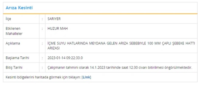Sarıyer’in Huzur Mahallesi’nde arıza sebebiyle saat 09:22’de başlayan su kesintisinin saat 12:30 civarında bitmesi bekleniyor. Sarıyer’de sular ne zaman gelecek şeklinde İSKİ’ye gelen çağrılara çalışmaların yoğun şekilde sürdüğü yönünde yanıt veriliyor.