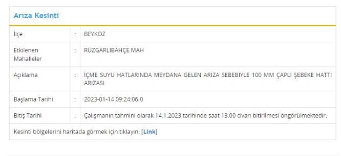 Beykoz’un Rüzgarlıbahçe Mahallesi’nde arıza sebebiyle saat 09:24’de başlayan su kesintisinin saat 13:00 civarında bitmesi bekleniyor. Beykoz’da sular ne zaman gelecek sorusuyla İSKİ’ye gelen çağrılara çalışmaların yoğun şekilde sürdüğü şeklinde yanıt geliyor.