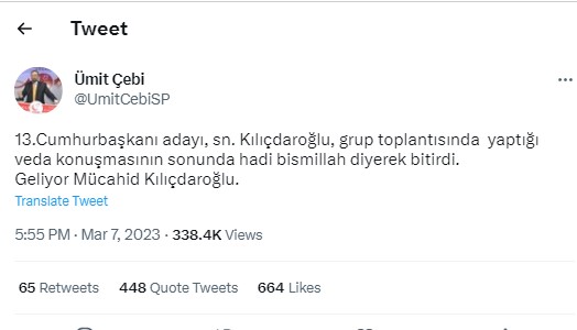 Saadet Partili Ümit Çebi Necmettin Erbakan ile özdeşleşen ‘mücahit’ unvanını Kılıçdaroğlu için kullandı. Saadet Partisi’nin Genel İdare Kurulu Üyesi Ümit Çebi, Milli Görüş hareketinin kurucu lideri Necmettin Erbakan ile özdeşleşen ‘mücahit’ unvanını Kılıçdaroğlu için kullanınca bir anda bir tartışmanın alevi fitillendi. Çebi, sosyal medya hesabından yaptığı paylaşımda. “Geliyor Mücahid Kılıçdaroğlu.” ifadesini kullananınca sosyal medyada tepki veren de oldu destek veren de…