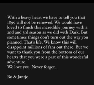 “1899’un yeni sezonunun gelmeyeceğini üzülerek açıklamak zorundayız. Bu mükemmel işi Dark’ta yaptığımız gibi 2. ve 3. sezonla bitirmeyi çok isterdik. Ancak bazen işler planladığınız gibi gitmez. Hayat böyle bir şey. Bunun milyonlarca hayranımızı hayal kırıklığına uğratacağını biliyoruz. Ancak bu harika maceranın bir parçası olduğunuz için size tüm kalbimizle teşekkür etmek istiyoruz. Sizi seviyoruz. Asla unutmayın.”