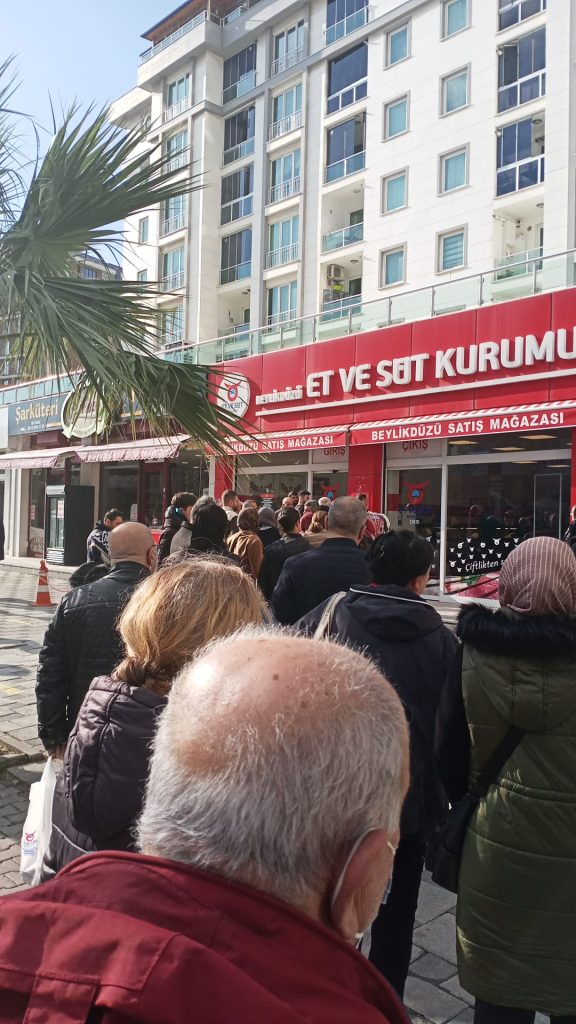 Vatandaşlar piyasa fiyatının neredeyse yarısı olan kuzu ve dana etinden kıyma, kuşbaşı ve tavuk alabilmek için erken sabahın erken saatlerinde Beylikdüzü’ndeki Et ve Süt Kurumu’na gelerek sıraya giriyor. Mağaza saat 09:00’da açılıyor ancak açılış saatinden önce gelip sıraya girmeyenler eli boş dönüyor.