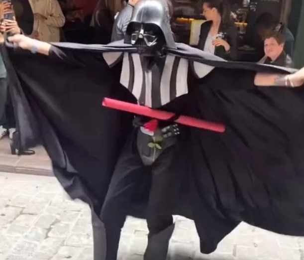 Birce Akalay, bir arkadaşının doğum güne çok ilginç bir kostümle katıldı. “Star Wars” hayranı arkadaşına sürpriz yapan Birce Akalay Darth Vader kostümüyle geldiği doğum günü kutlamasında Roman havasında göbek attı. Kostümünü çıkardığında göbek atan Darth Vader’in Birce Akalay olduğunu görenler cep telefonuna sarıldı.