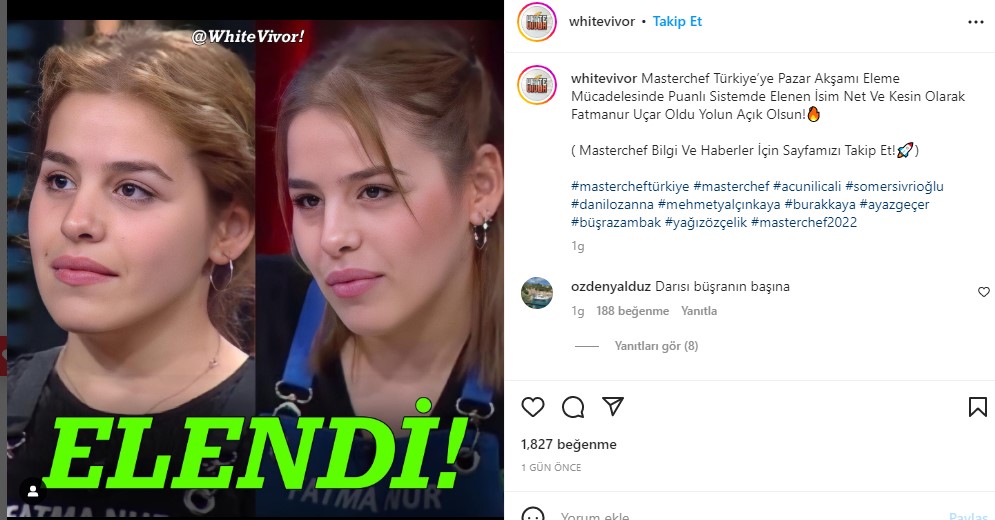 WhiteVivor isimli Instagram hesabı, elenen ismi açıklayarak, “’MasterChef Türkiye’ye pazar akşamı eleme mücadelesinde puanlı sistemde elenen isim net ve kesin olarak Fatmanur Uçar oldu. Yolun açık olsun!” paylaşımı yaptı.