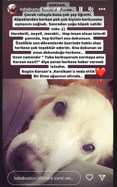 Tuba Büyüküstün acı haberi sosyal medya hesabı Instagramdan paylaştı. Büyüküstün köpeği Korsan’ın ölümü üzerine yaşadığı acıyı şu sözlerle duyurdu: