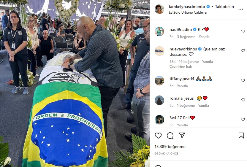 Pele’nin hastalığından ölüm anına kadar sürekli hastanede yanında olan kızı Kely Nascimento Stadyumdaki törenden bir fotoğraf paylaştı. Instagram hesabında babası Pele’nin tabutta Brezilya Bayrağına sarılı naaşının fotoğrafını paylaşan Kely Nascimento’nun sosyal medya hesabına yorum yağdı.