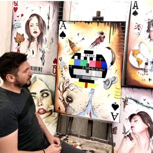 Çatlamış duvarlar, küçük minimal gölge insanlar ve iskambil kâğıdı gibi aykırı ve öznel araçları tercih eden genç ressam, birçok kentte sergi açtı.